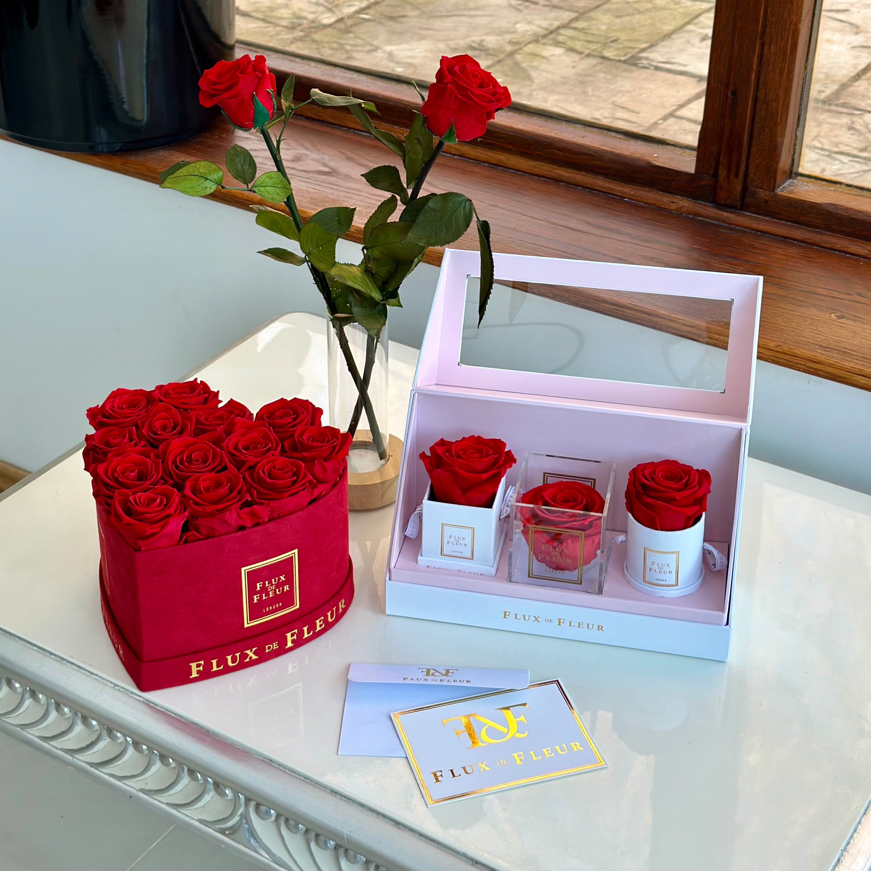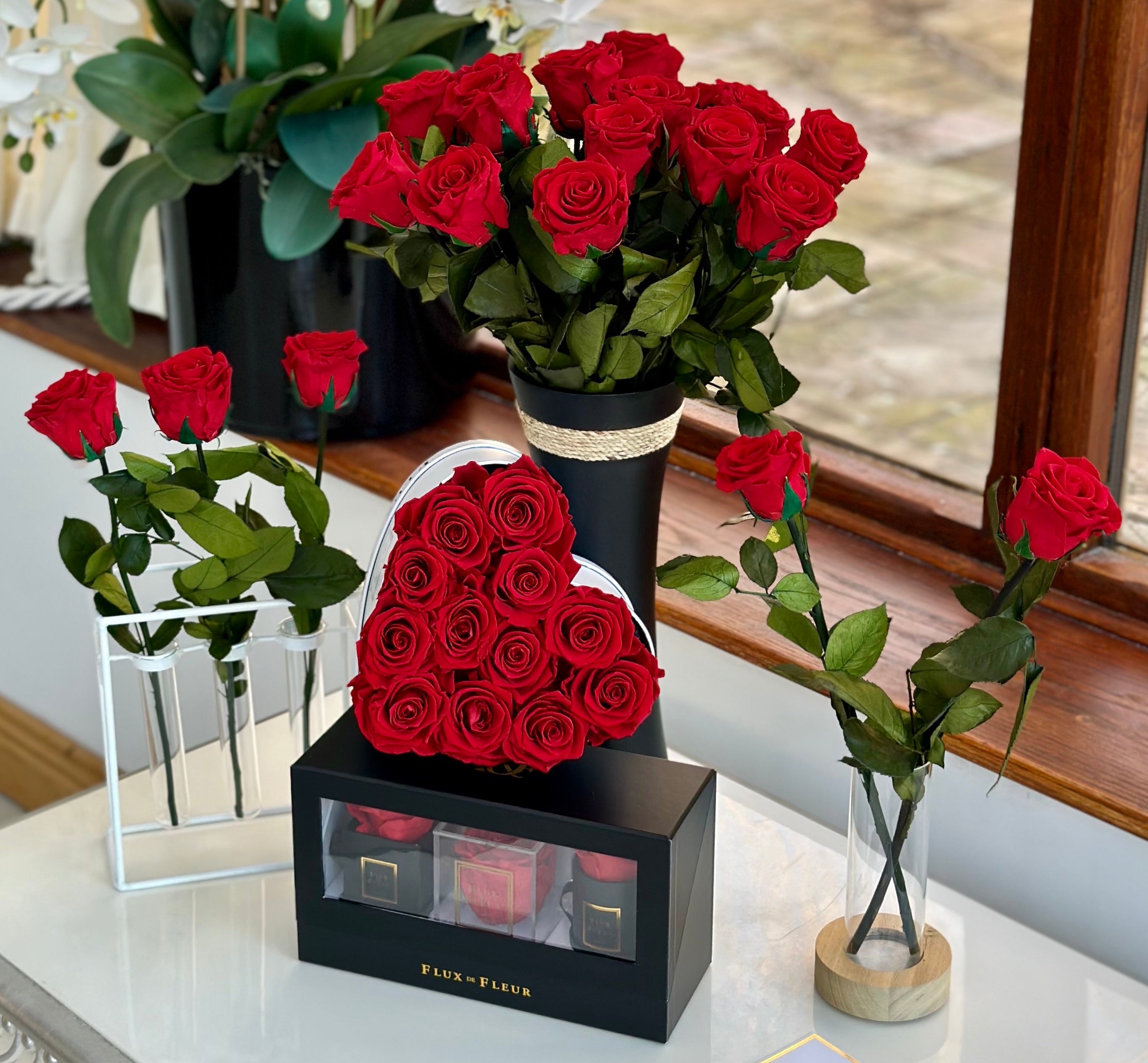 Here at Flux De Fleur, you'll find a variety of luxurious floral displays featuring real roses that last up to a year or longer.
