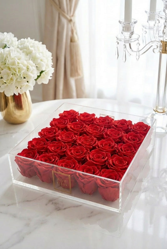 A limited-edition collection of clear acrylic rose boxes designed to showcase eternity...
