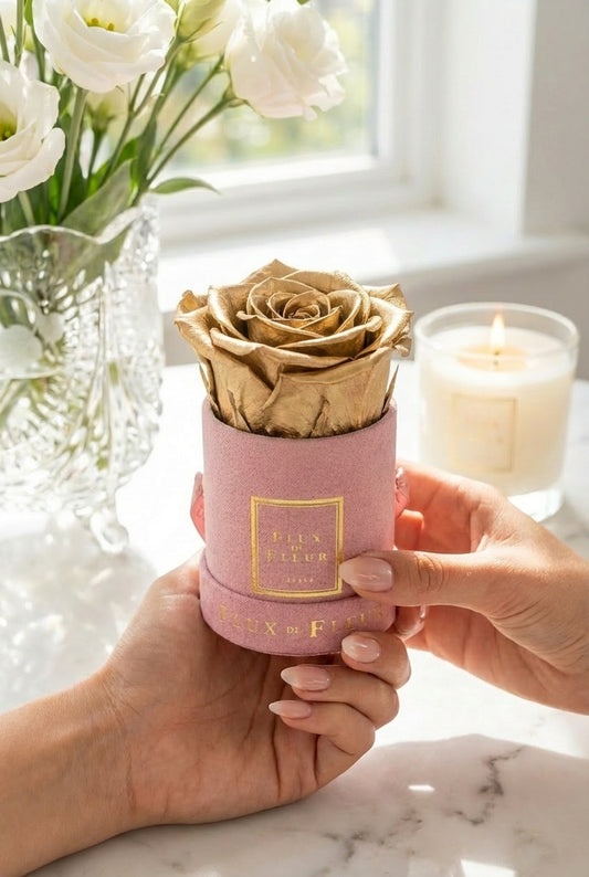 There are eternal roses for every price range. If you don’t believe that giving two dozen eternal roses is an appropriate gift, you can simply purchase a mini Crystal de Fleur, or three eternal roses in a mini heart-shaped box.