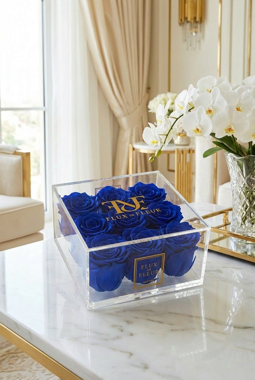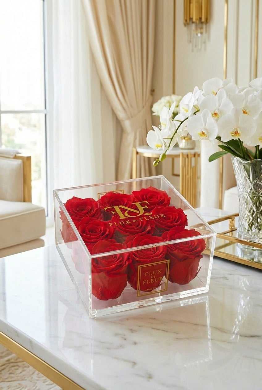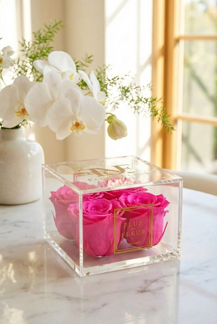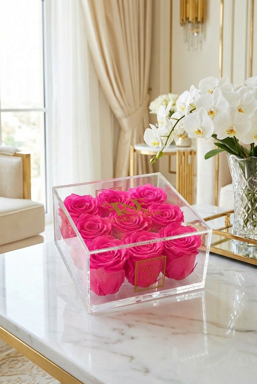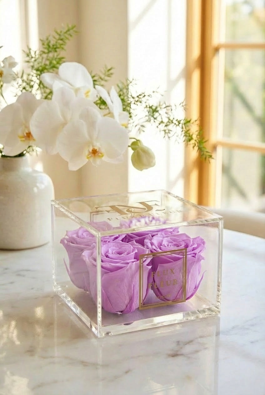 Presented in a French-inspired clear acrylic box, each arrangement is individually crafted to embody everlasting love and refined elegance while showcasing eternity roses protected by a clear lid that is removable.