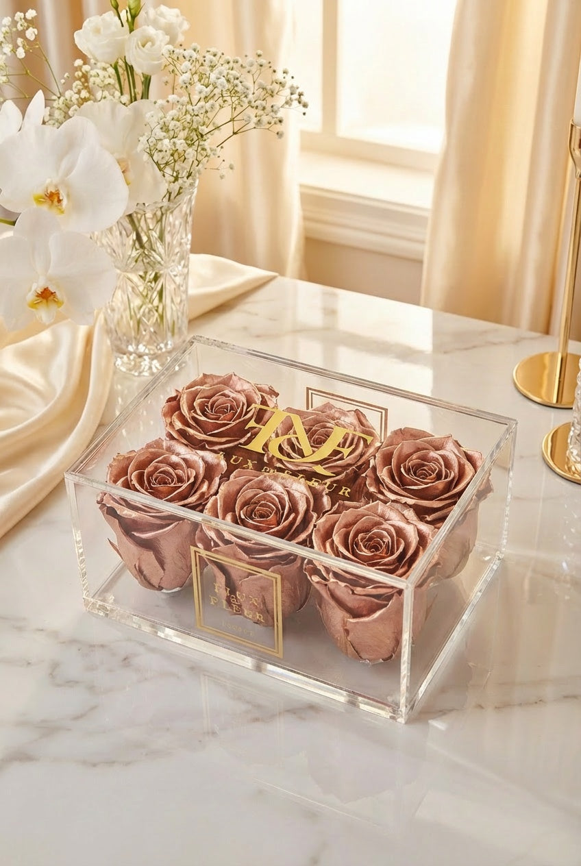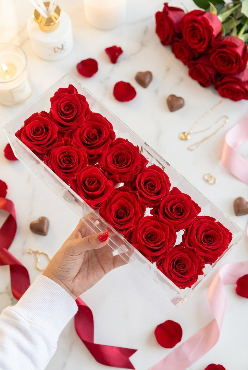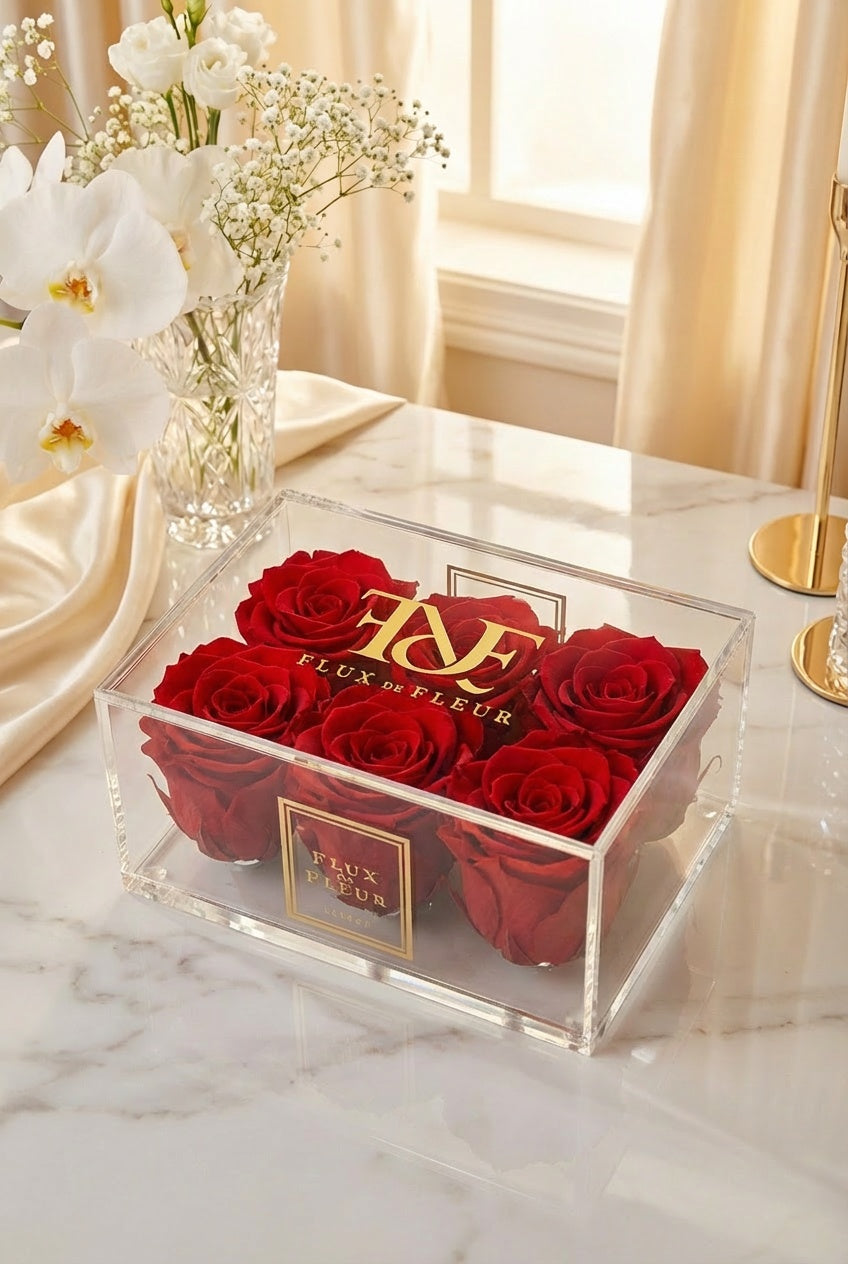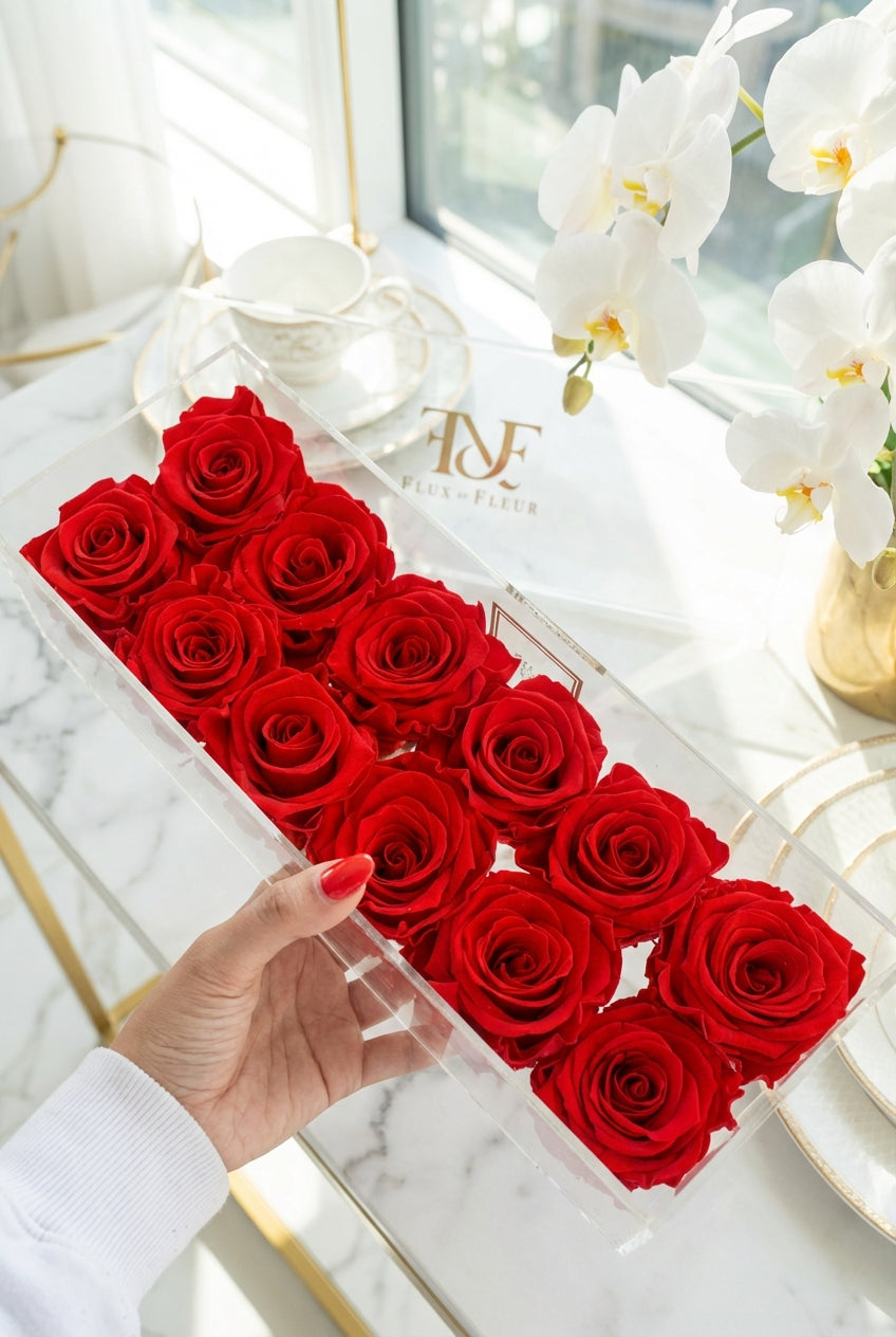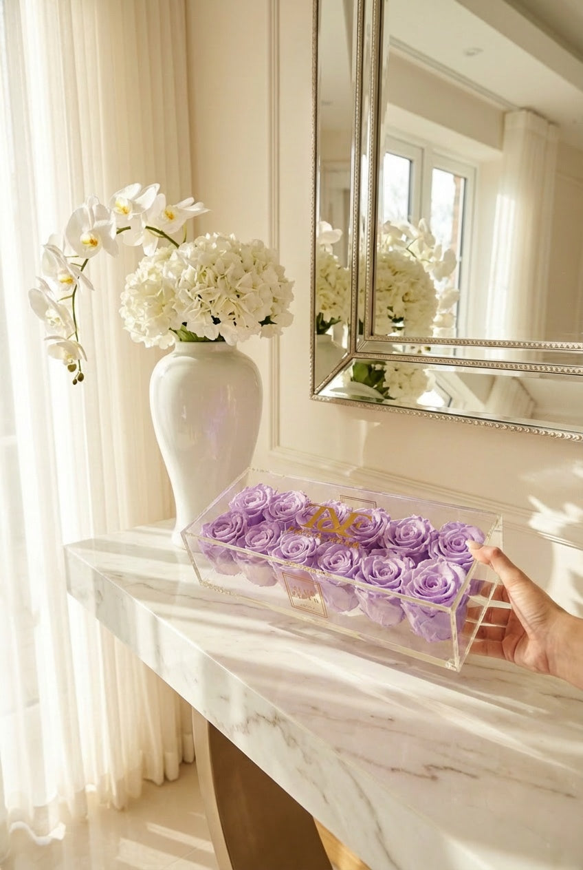 Presented in a French-inspired clear acrylic box, each arrangement is individually crafted to embody everlasting love and refined elegance while showcasing eternity roses protected by a clear lid that is removable.