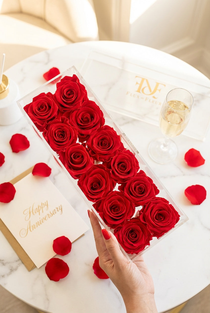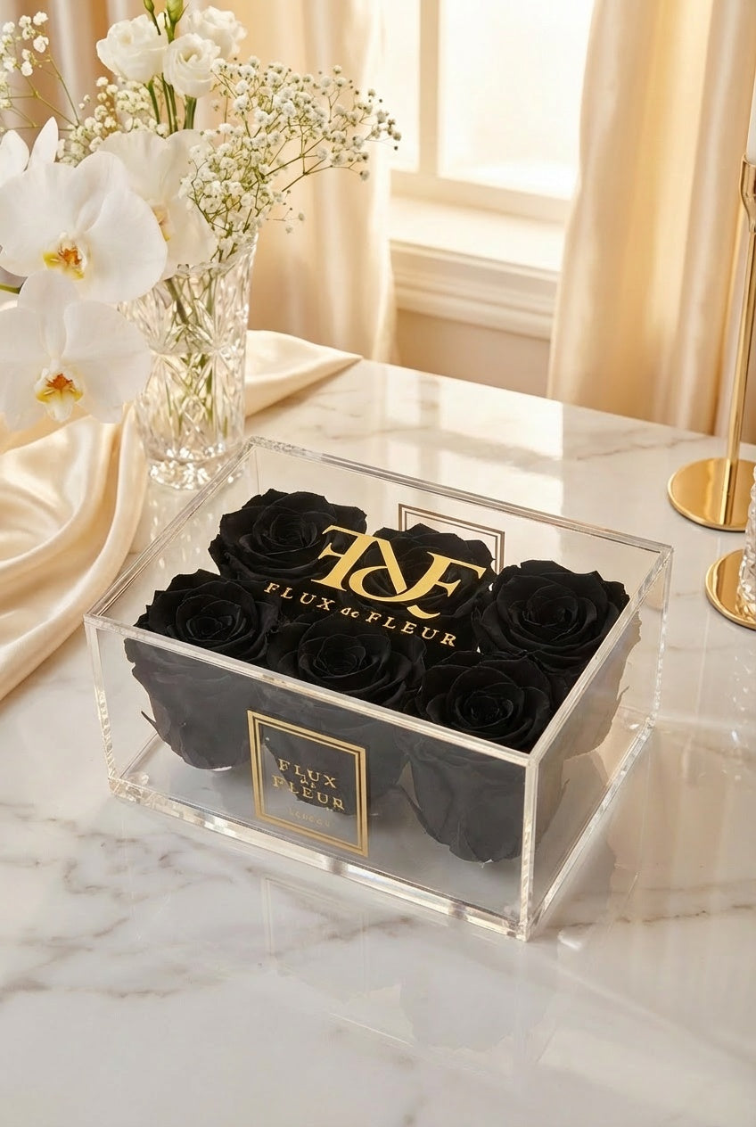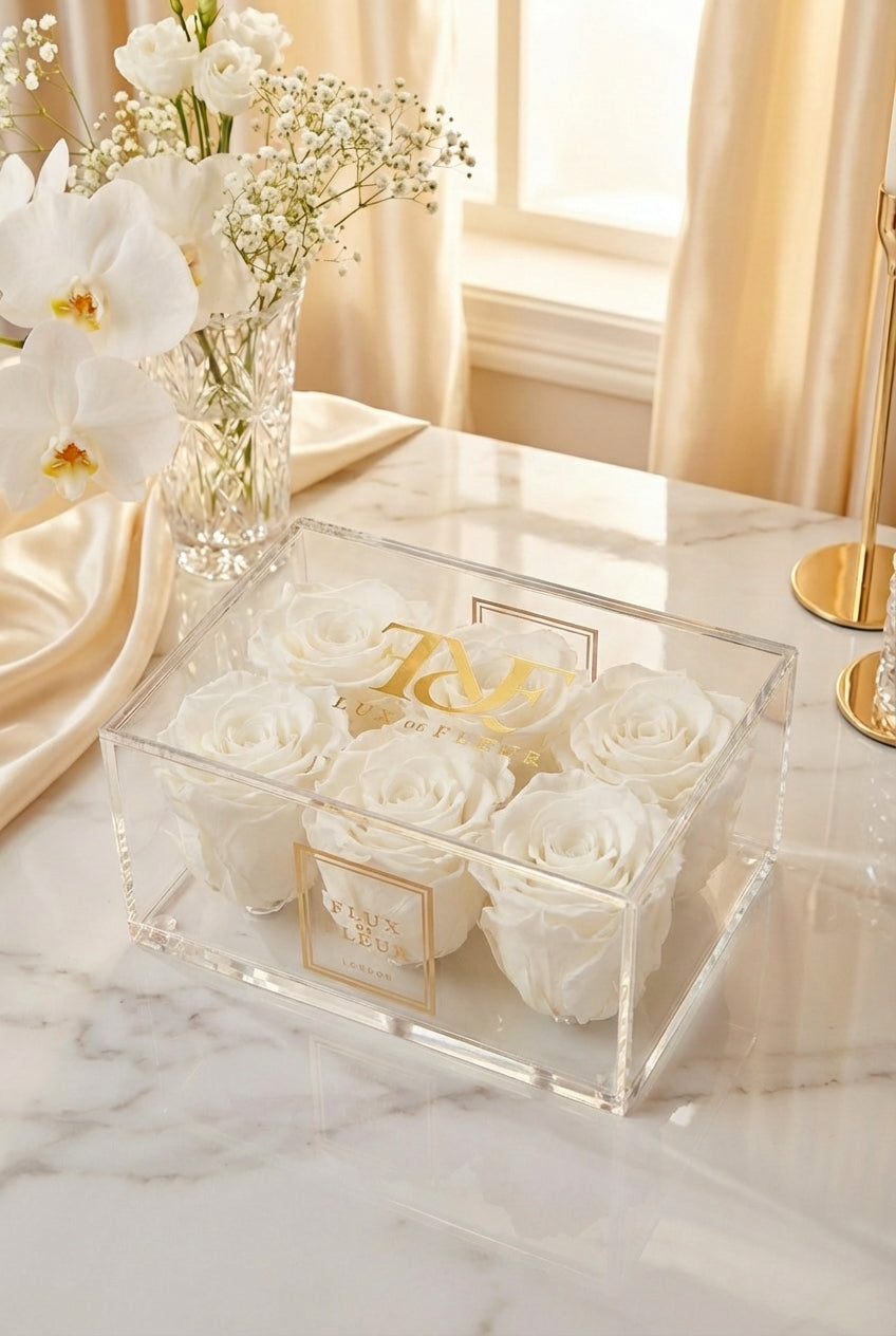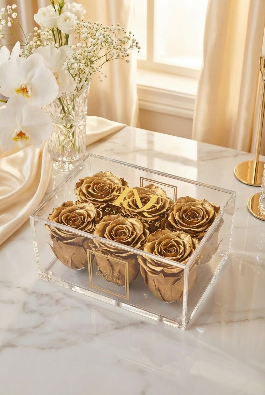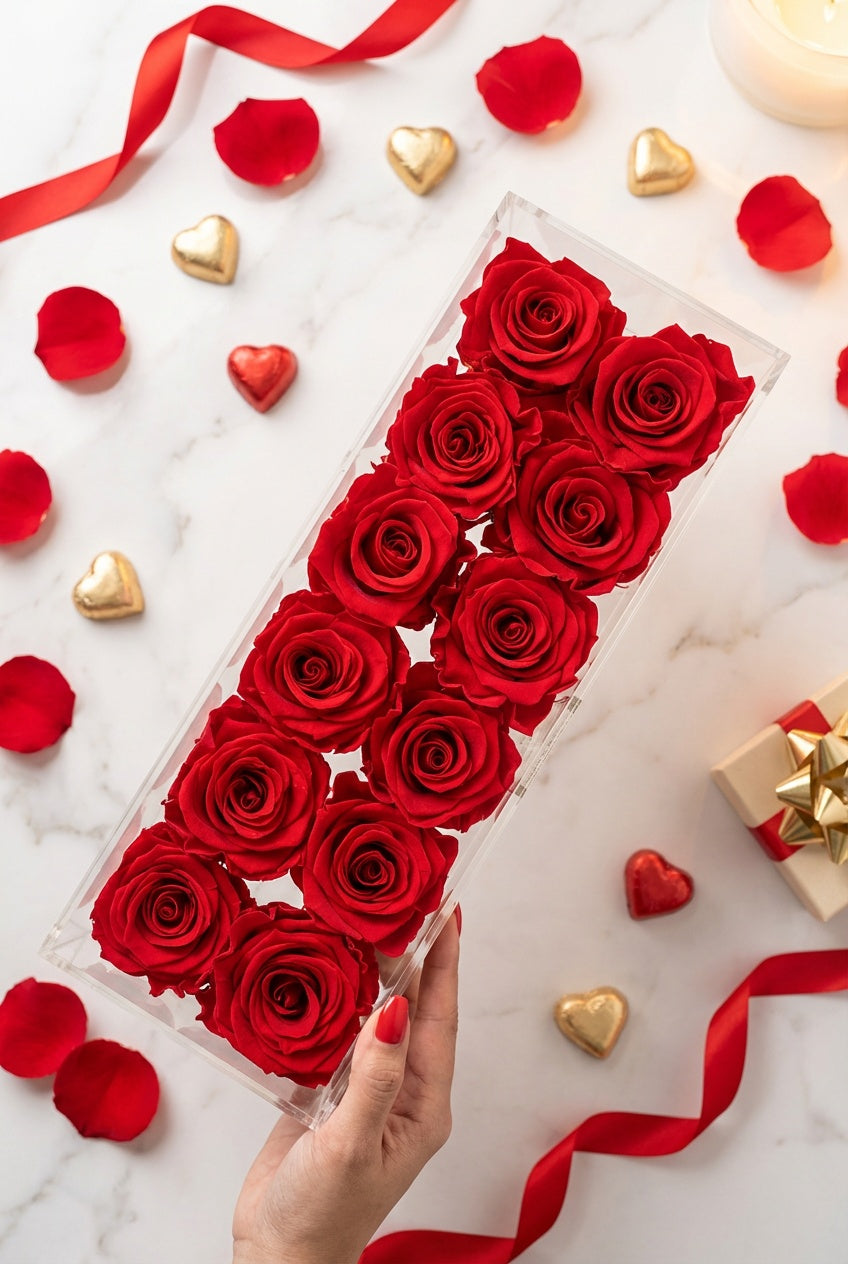 Presented in a French-inspired clear acrylic box, each arrangement is individually crafted to embody everlasting love and refined elegance while showcasing eternity roses protected by a clear lid that is removable.
