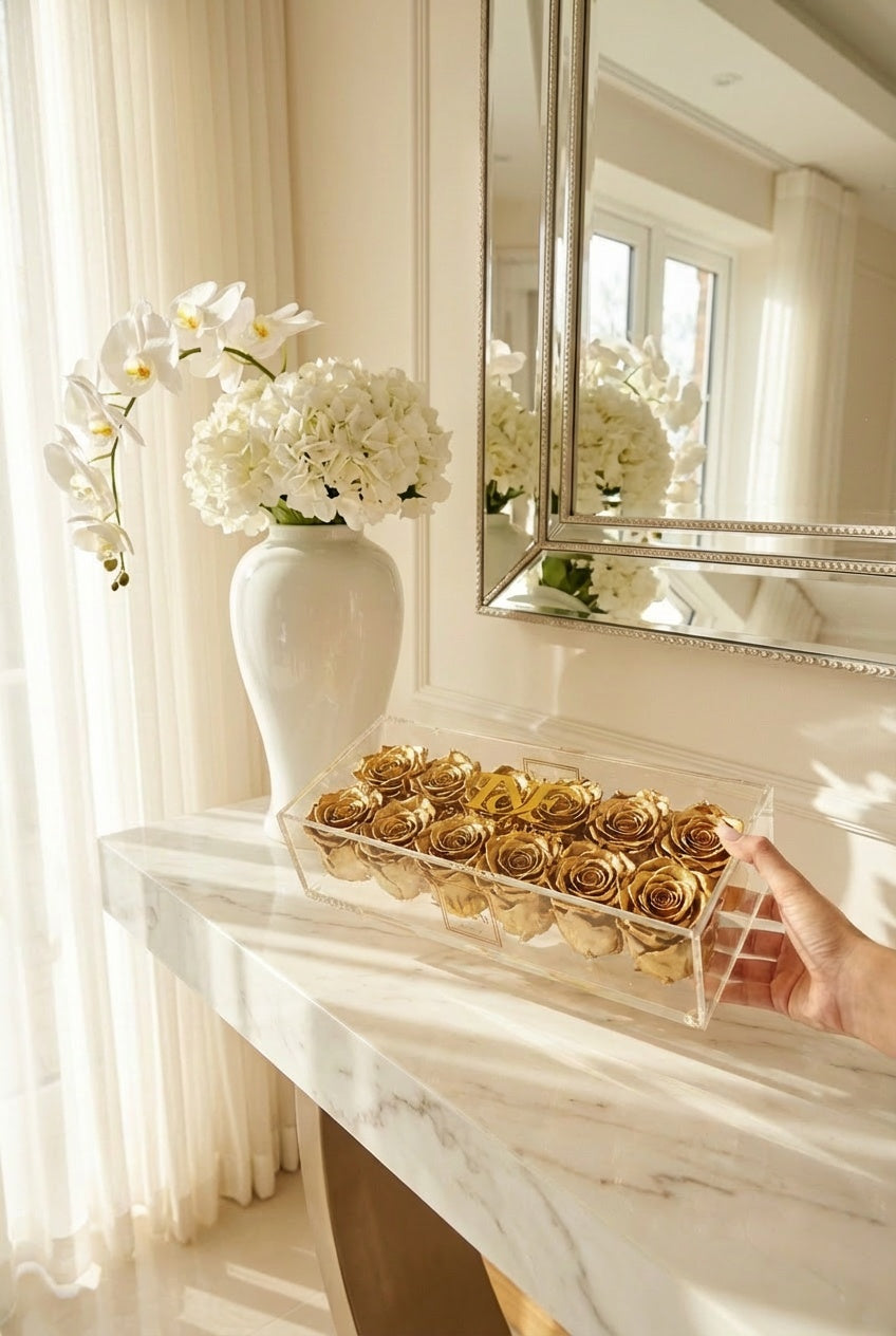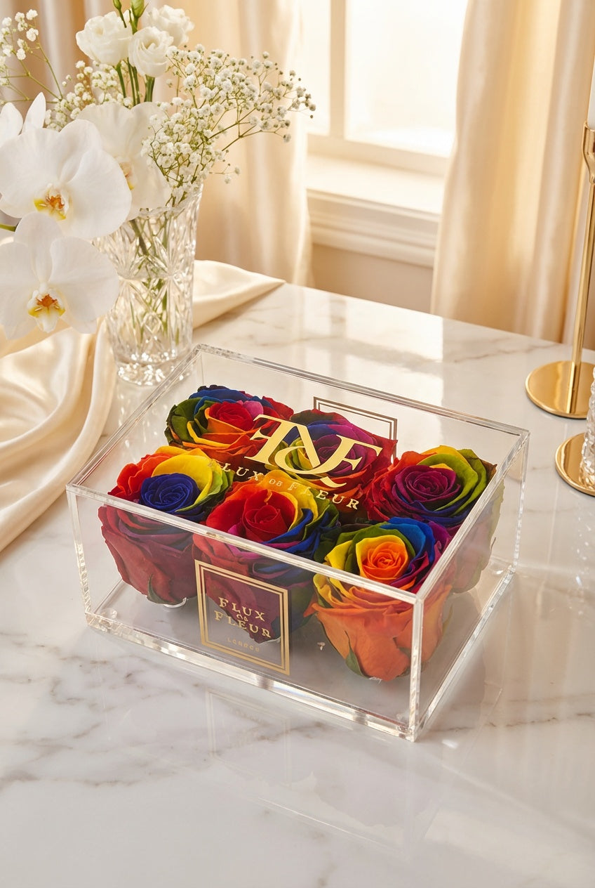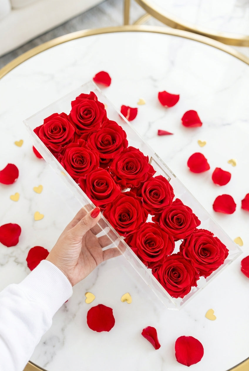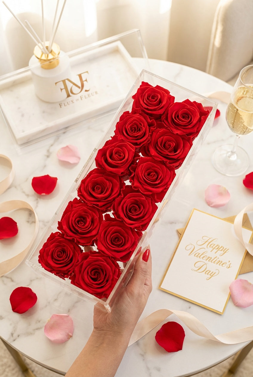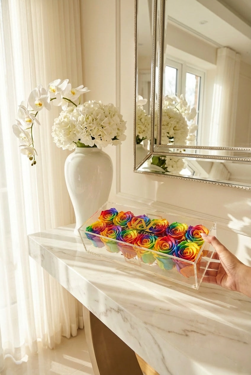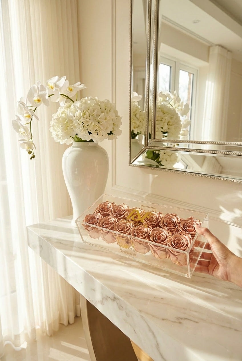 Presented in a French-inspired clear acrylic box, each arrangement is individually crafted to embody everlasting love and refined elegance while showcasing eternity roses protected by a clear lid that is removable.