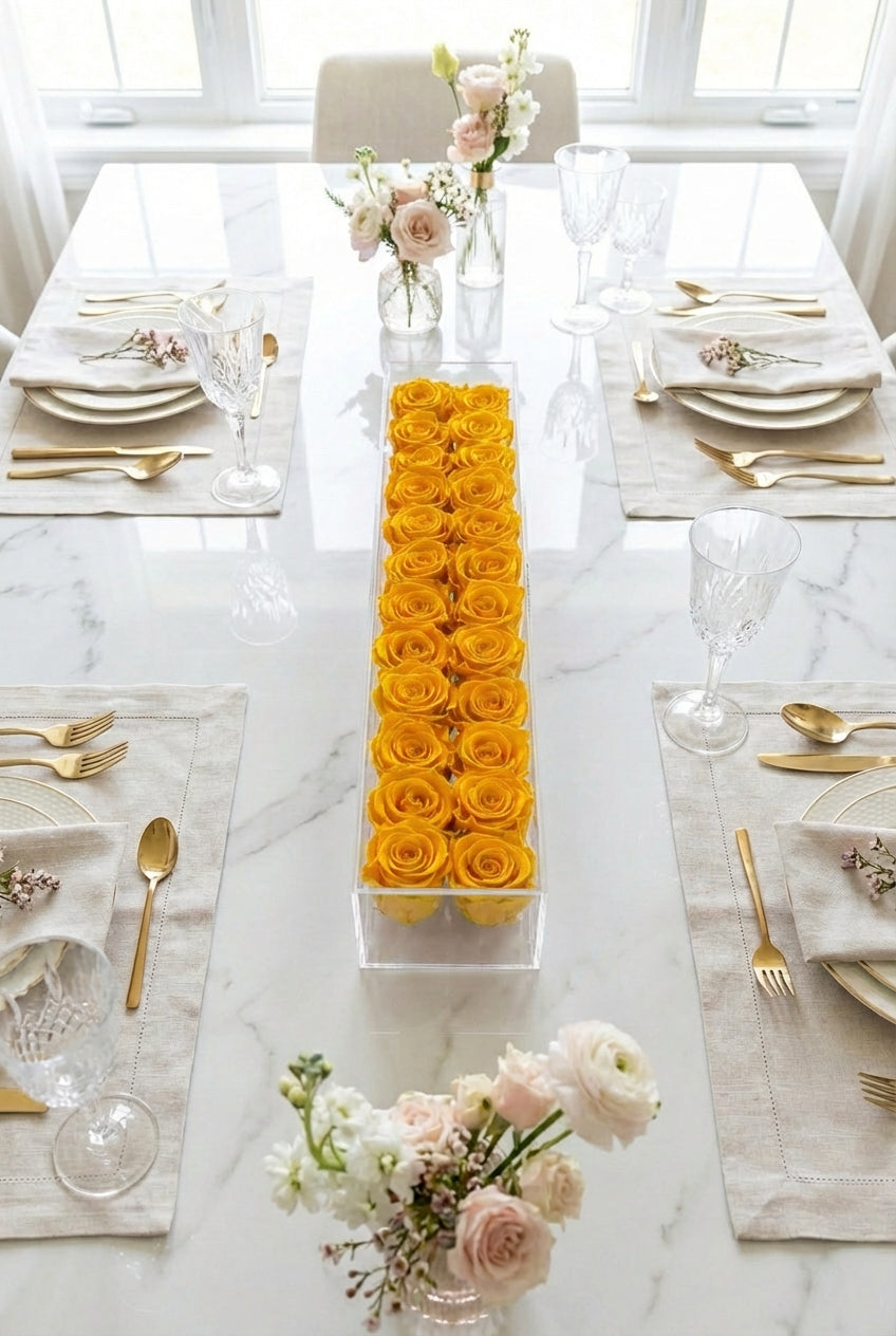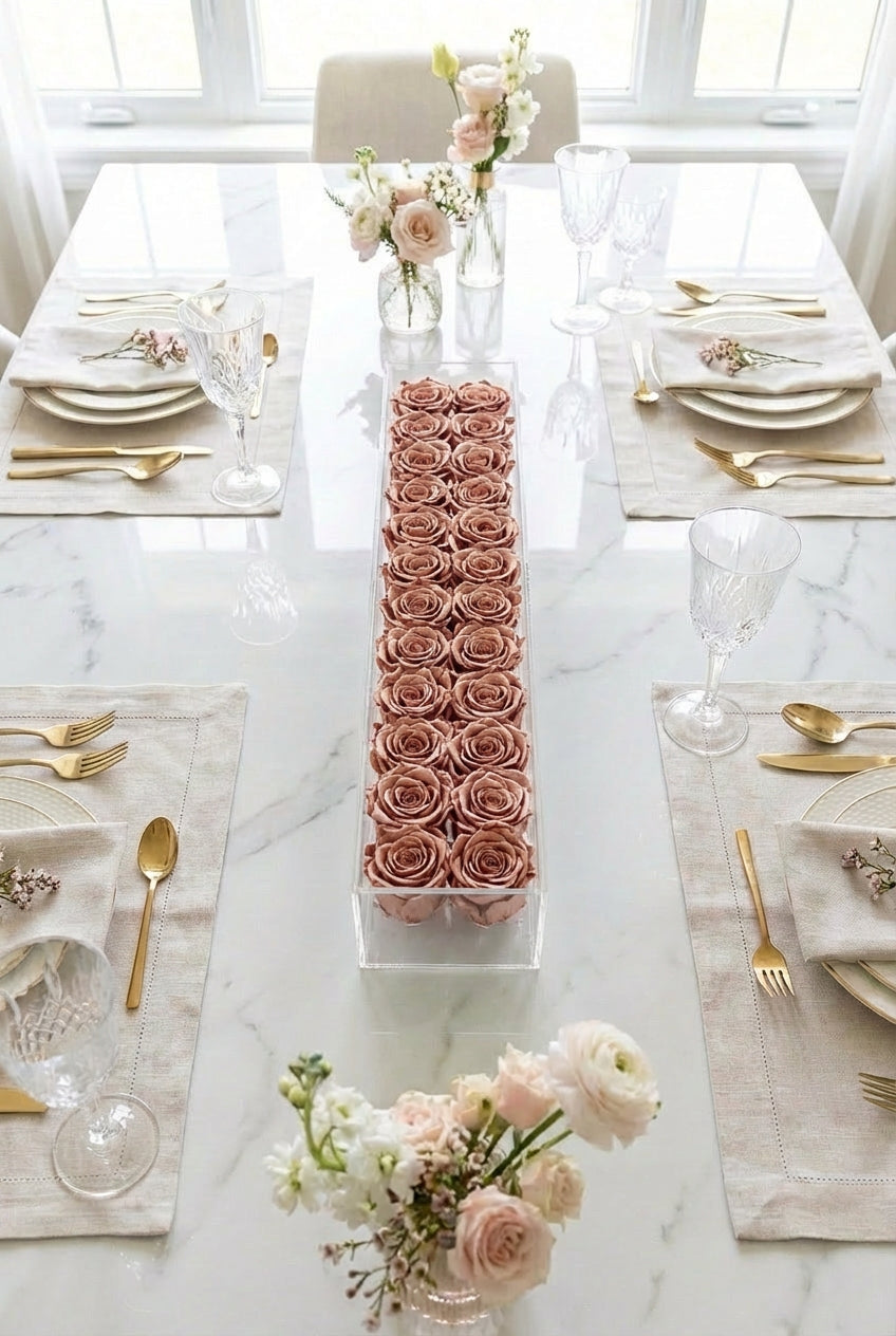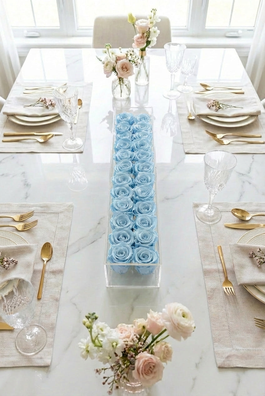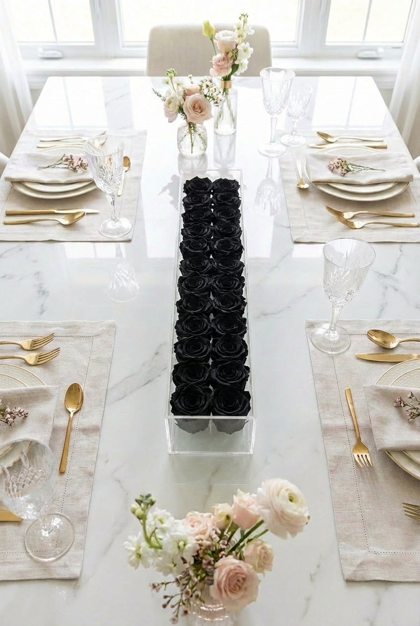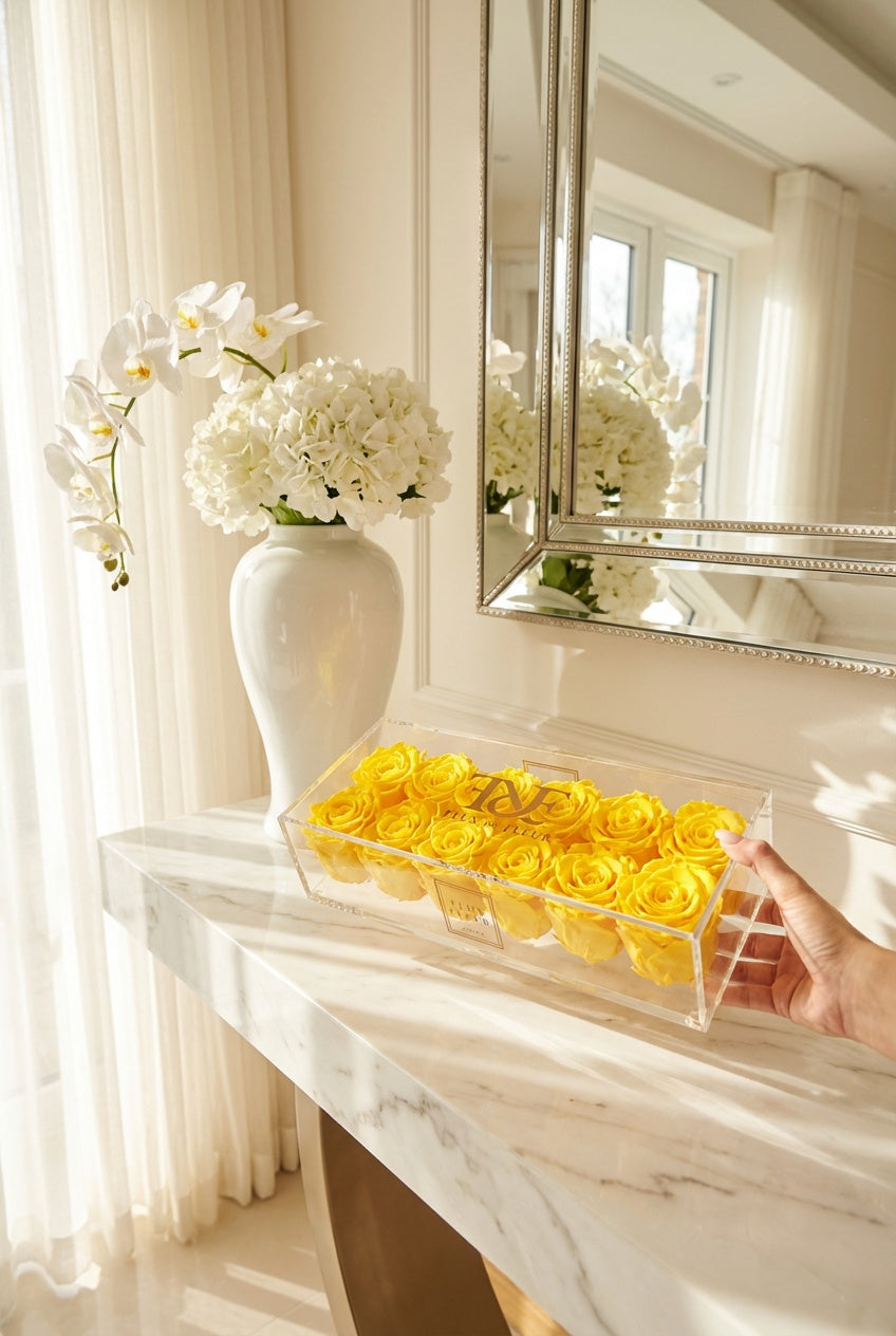 Presented in a French-inspired clear acrylic box, each arrangement is individually crafted to embody everlasting love and refined elegance while showcasing eternity roses protected by a clear lid that is removable.