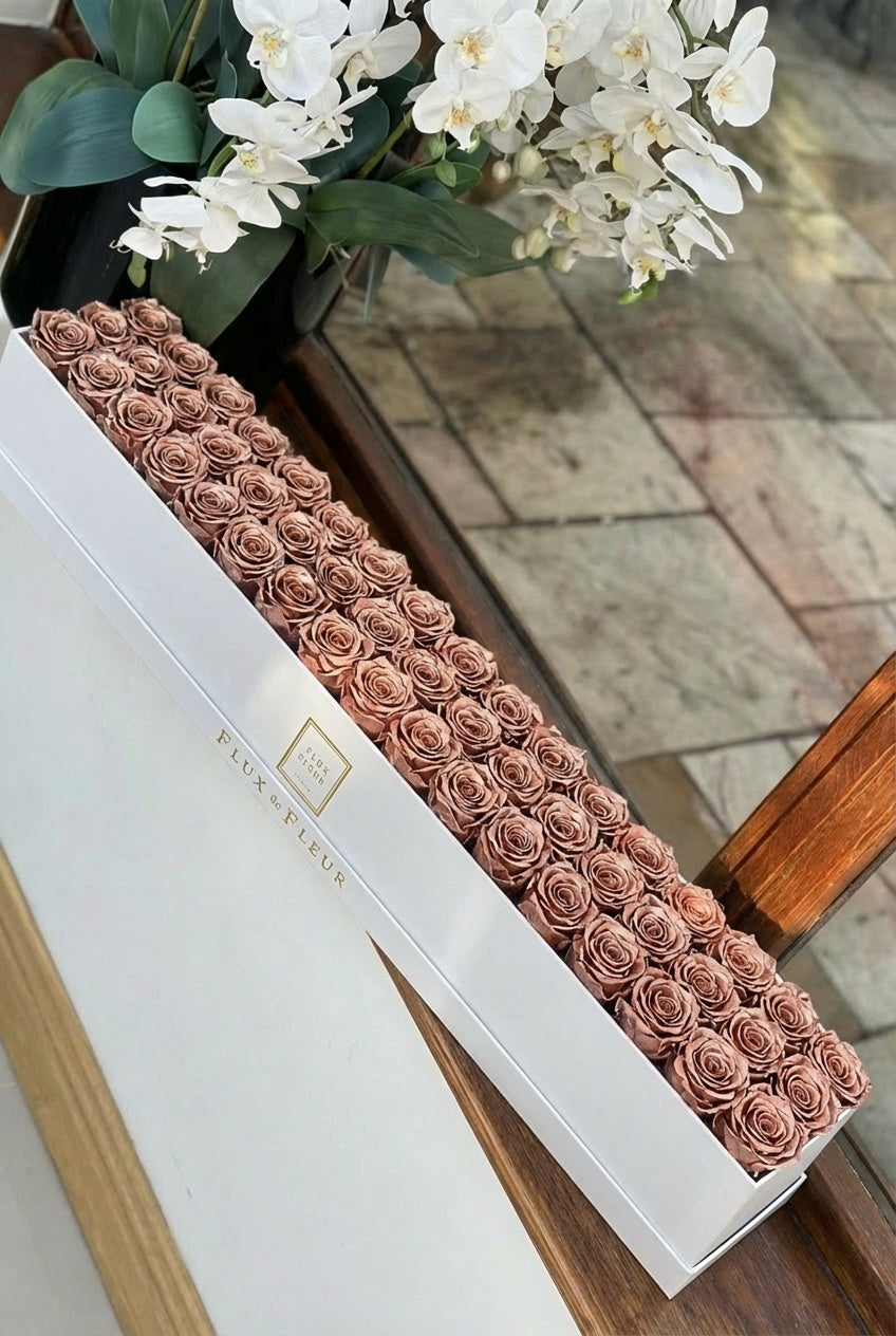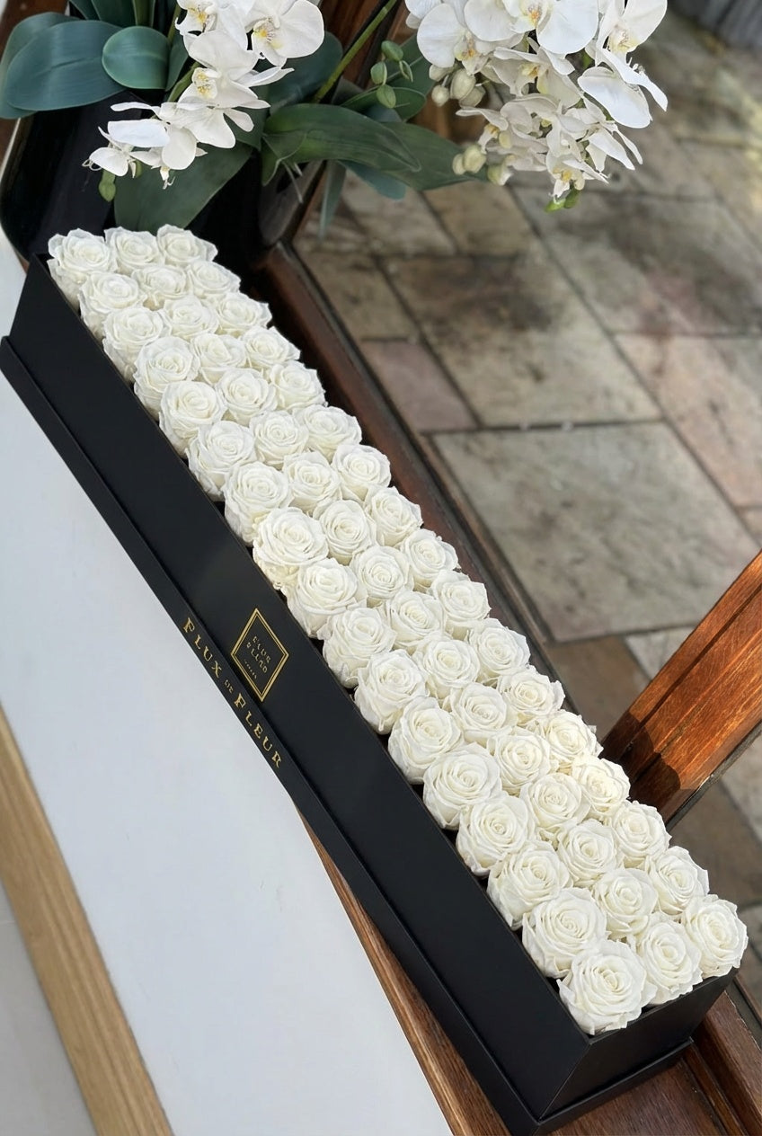 Presented in an elegant French-inspired hat box, each arrangement is individually created to embody everlasting love and refined sophistication. This arrangement is a timeless statement of elegance.