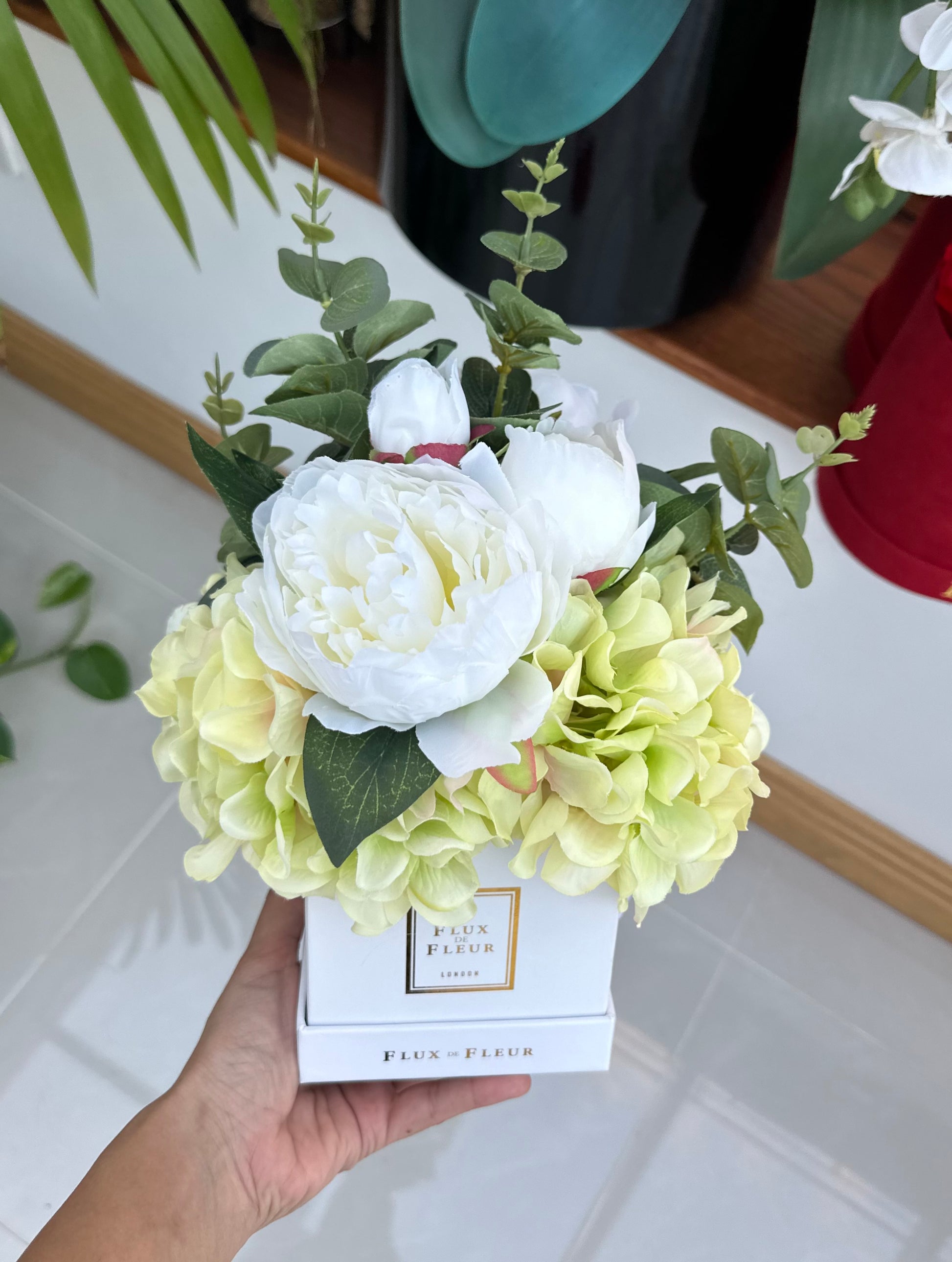 Small Arrangements: 4 Hydrangeas (Green), Peonies (White) 6 steams mix flowers heads & buds and few steams of Eucalyptus. Box size approx 4 x 4 x 6 inches (width & length) approx 13 inches (height)